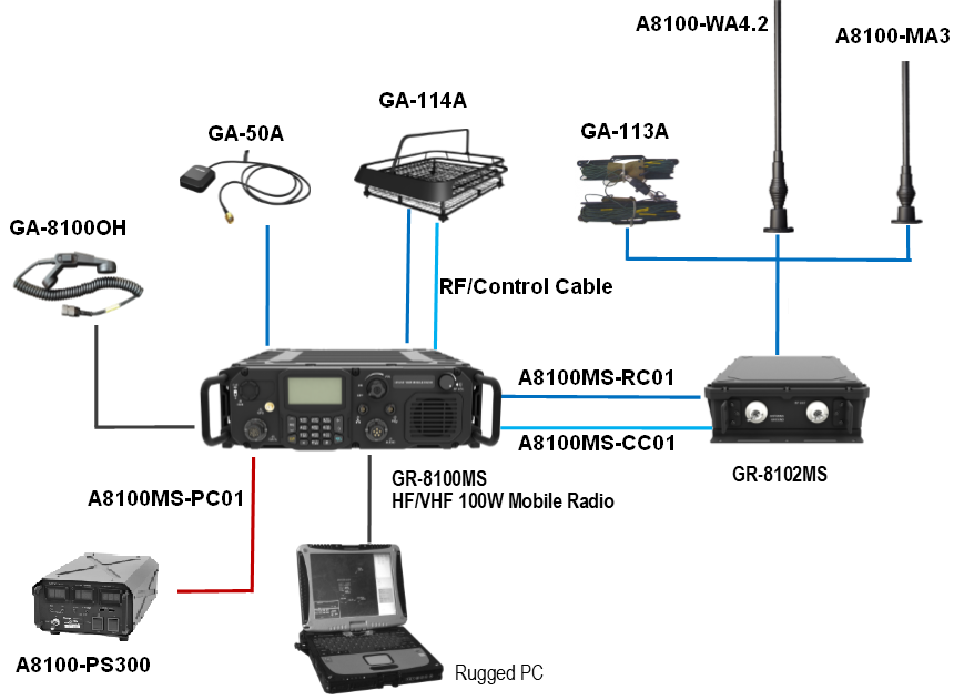 The Glocom GR-8100MS HF/VHF 100W mobile radio system reaches the highest level in wideband data performance and interoperability with fielded GR-150 HF manpack radio, GR-250 VHF manpack radio and GR- 310 V/UHF STACOM manpack radio - to deliver information superiority on today’s battlefields. It provides continuous coverage from 1.6 to 60MHz, 100W HF and 50W VHF, and HF bandwidths from 3 to 24 kHz - with data rates of up to 76.8 kbps.